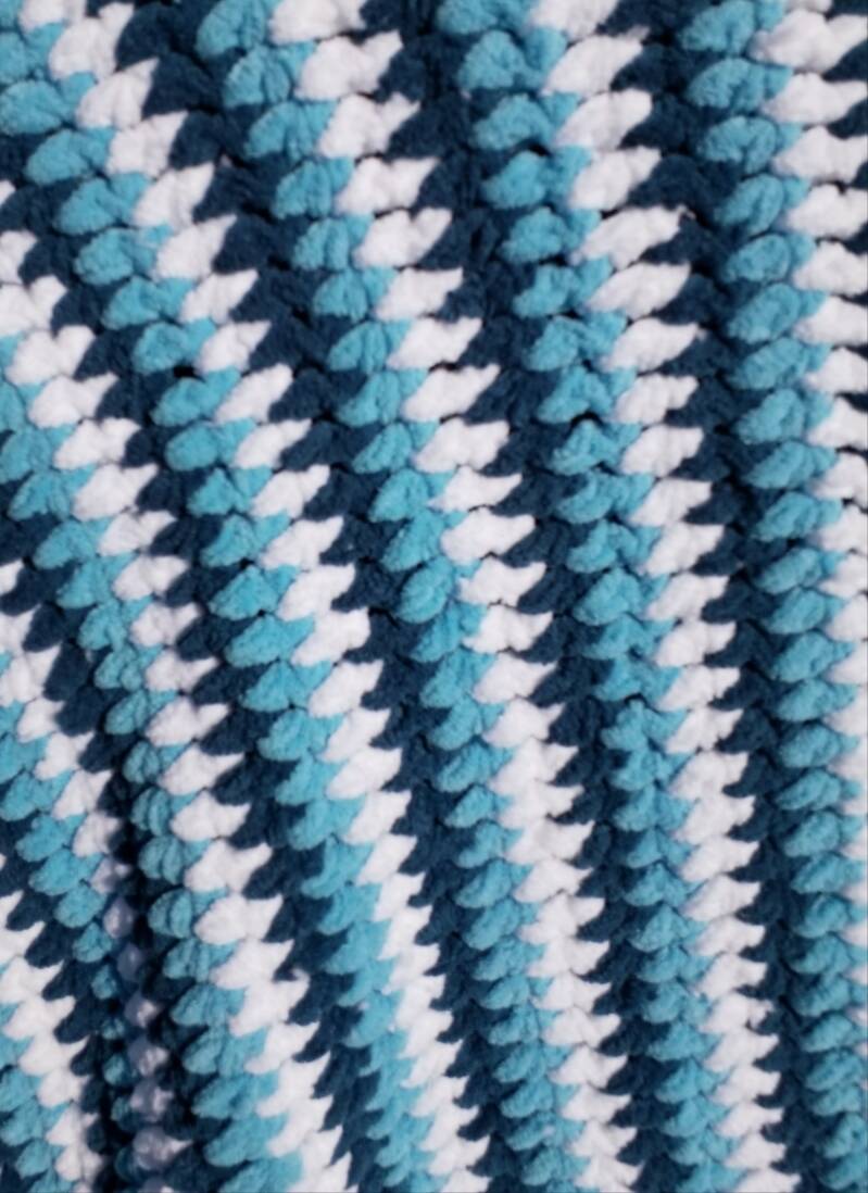 This chunky crocheted throw is so velvety soft and warm! Made with supur chunky chenille yarn in blues and white.