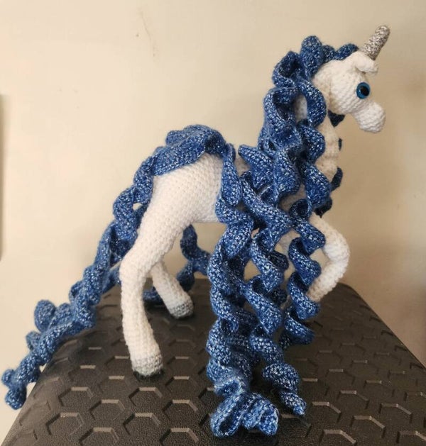 Beautiful unicorn with silver hoofs and horn, blue eyes, and silvery blue mane and tail.